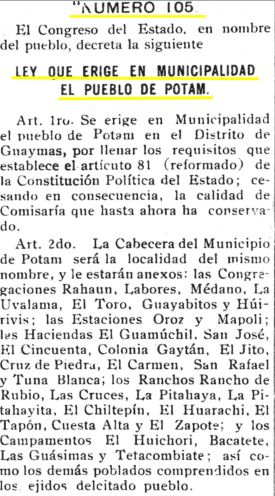 De la división territorial. Art 1°. El territorio del Estado, para su régimen interior, se divide en Distritos, municipalidades y comisarías, con arreglo a la Constitución del mismo. 2°. El número de Distritos en que el Estado queda dividido es el de nueve: el de las municipalidades, es el de los pueblo que lleguen a quinientos habitantes; y el de las comisarías, el de los pueblos, aldeas o congregaciones, haciendas y ranchos que no lleguen a este número. Art. 6°. La demarcación del Distrito de Guaymas, comprenderá las poblaciones siguientes. Ciudad de Guaymas. Villa de San José, pueblo de Buenavista, pueblo de Cumuripa, pueblo de Cócorit, pueblo de Bácum, pueblo de Tórim, pueblo de Vícam, pueblo de Pótam, pueblo de Rahúm, pueblo de Huirivis, pueblo de Belem. Esta Ley se publica en tres números del periódico oficial "La Estrella del Occidente", en el 142, 144 y 413