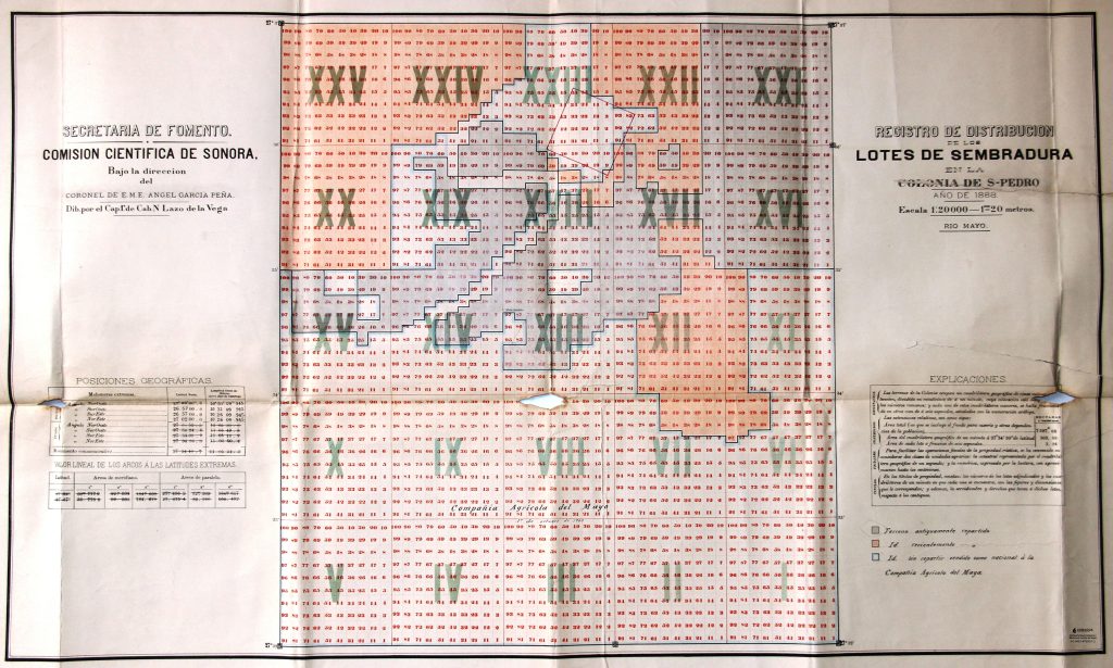 Para la lectura del presente mapa podemos guiarnos por dos antecedentes principales: el primero es la expedición del Decreto de colonización y compañías deslindadoras el 15 de diciembre de 1883, el cual, sería fue ejecutado en el Distrito de Álamos por la Comisión Científica de Sonora (CCS, destacamento operativo de la Comisión Geográfica Exploradora), con la entrega de lotes para siembra y vivienda a vecinos de las colonias de Huatabampo, San Pedro, Cohuirimpo y Etchojoa en el Valle del Mayo.  El segundo momento cronológico se encuentra en 1887, cuando los comisionados indígenas de los ríos Yaqui, Mayo y Fuerte, presentaron al presidente de la república su deseo para ser dotados con terrenos destinados a la agricultura. En atención a ello, el general Díaz dio la orden para que el personal de la CGE con sede en Xalapa, Veracruz, se trasladara a la entidad sonorense bajo las órdenes del coronel Agustín Díaz, para llevar a cabo “el trazo, fraccionamiento y reparto de terrenos entre los indígenas de los ríos Yaqui y Mayo”.