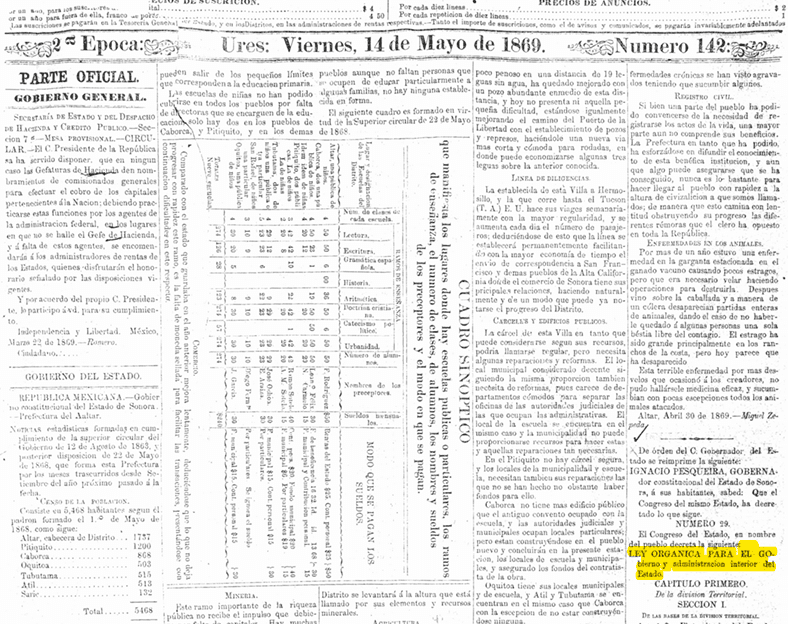 En 1869 se promulga una nueva Ley orgánica para el gobierno y la administración interior del Estado. El territorio se subdivide en los 9 distritos de: Ures, Hermosillo, Guaymas, Álamos, Sahuaripa, Moctezuma, Arizpe, Magdalena y Altar.
