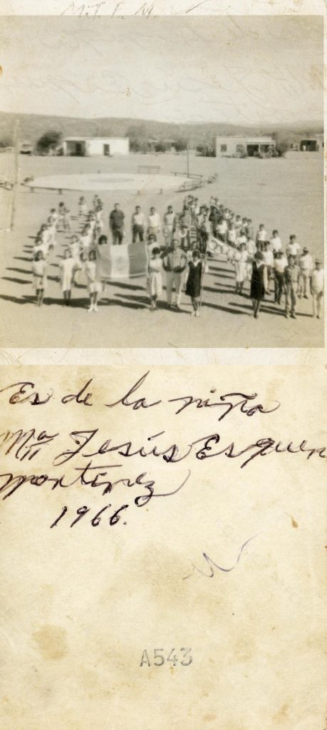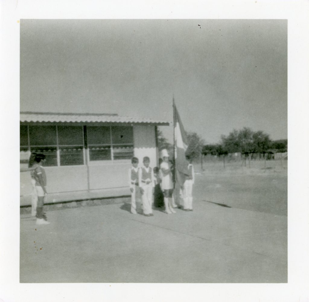 La foto que aquí se presenta, tomada en 1966 desde el techo de la primera escuela del nuevo pueblo de Cumuripa, muestra los honores a la bandera realizados por los estudiantes en la plaza del pueblo, realizada de forma circular con bancas alrededor, como en el pueblo antiguo.