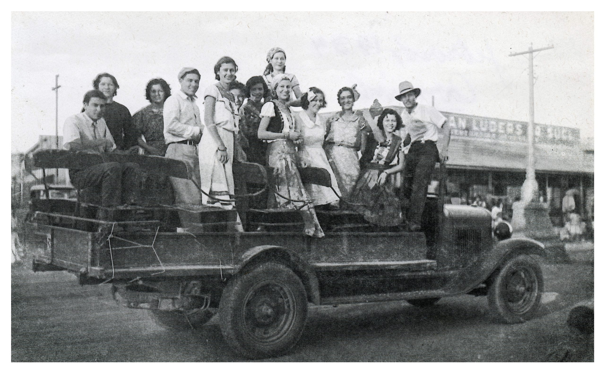 La imagen es un testimonio visual del proceso de interacción social y asimilación cultural en la creciente comunidad de Cajeme. La hija del colono Jim Huffaker, Barbara, viste un traje tradicional mexicano (China Poblana), mientras que otras señoritas visten disfraces de gitanas, reflejando la mezcla de tradiciones locales y europeas propias de las festividades de Carnaval. La ubicación se especifica en la Calle No Reelección, frente a la Tienda de Luders, indicando la consolidación de calles pavimentadas y negocios formales en el centro urbano.