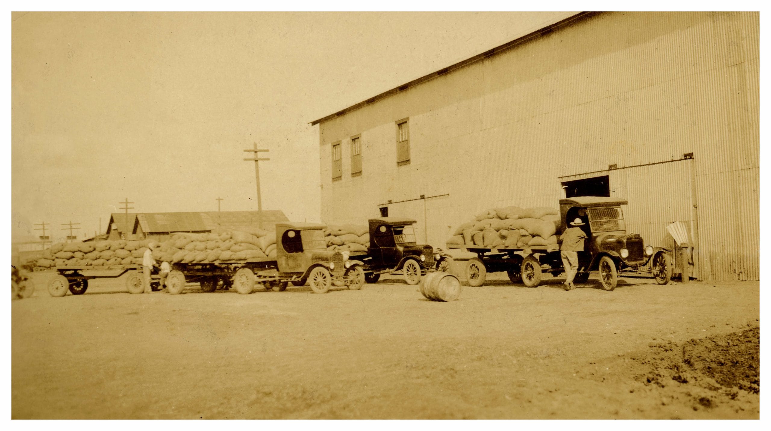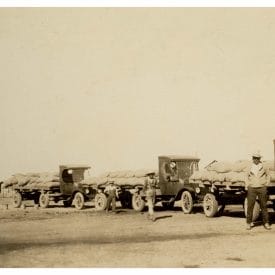 [Camiones Fordson descargando sacos de arroz en la molina de Cajeme]