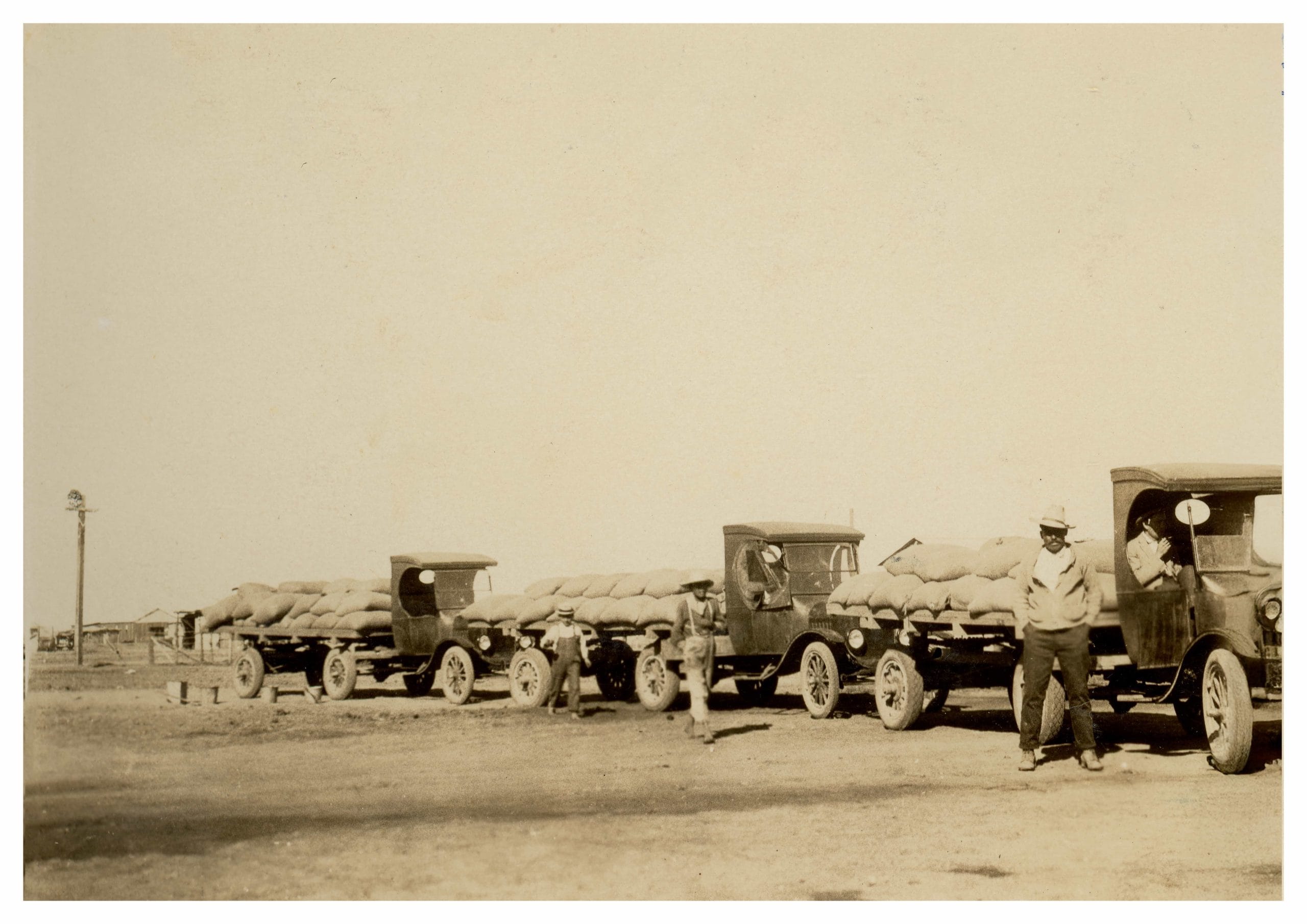 Las fotografías muestran camiones Fordson (posiblemente con remolques Nabors, como sugiere el manuscrito) cargados con sacos de arroz, esperando para descargar en la molina de arroz ubicada al sur del pueblo. Esta escena evidencia la rápida adopción de la motorización (vehículos Fordson, distribuidos por colonos como Jim Huffaker) para el transporte de cosechas, reemplazando las carretas de mulos (ver RS-MC-2025-250).