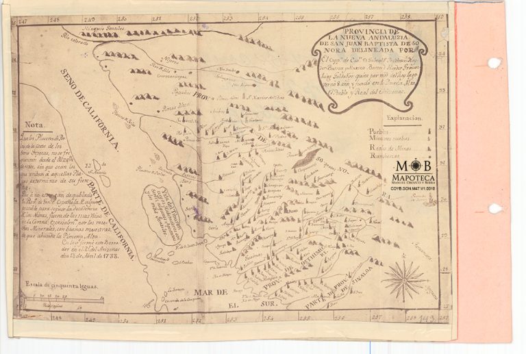 El Ministerio de Fomento, Colonización, Industria y Comercio, como su nombre lo indica, pretendía cumplir una gran diversidad de funciones, entre ellas la relacionada a recopilar información sobre la cartografía y la estadística del país. Ejemplo de ello es el presente mapa, realizado décadas antes de la creación del Ministerio (con base en la información plasmada), en el cual se traza el Estado de Sonora, indicando la topografía, hidrografía y división administrativa del momento, con los partidos de San Ignacio, Arizpe, Álamos y el Distrito de Baroyeca.