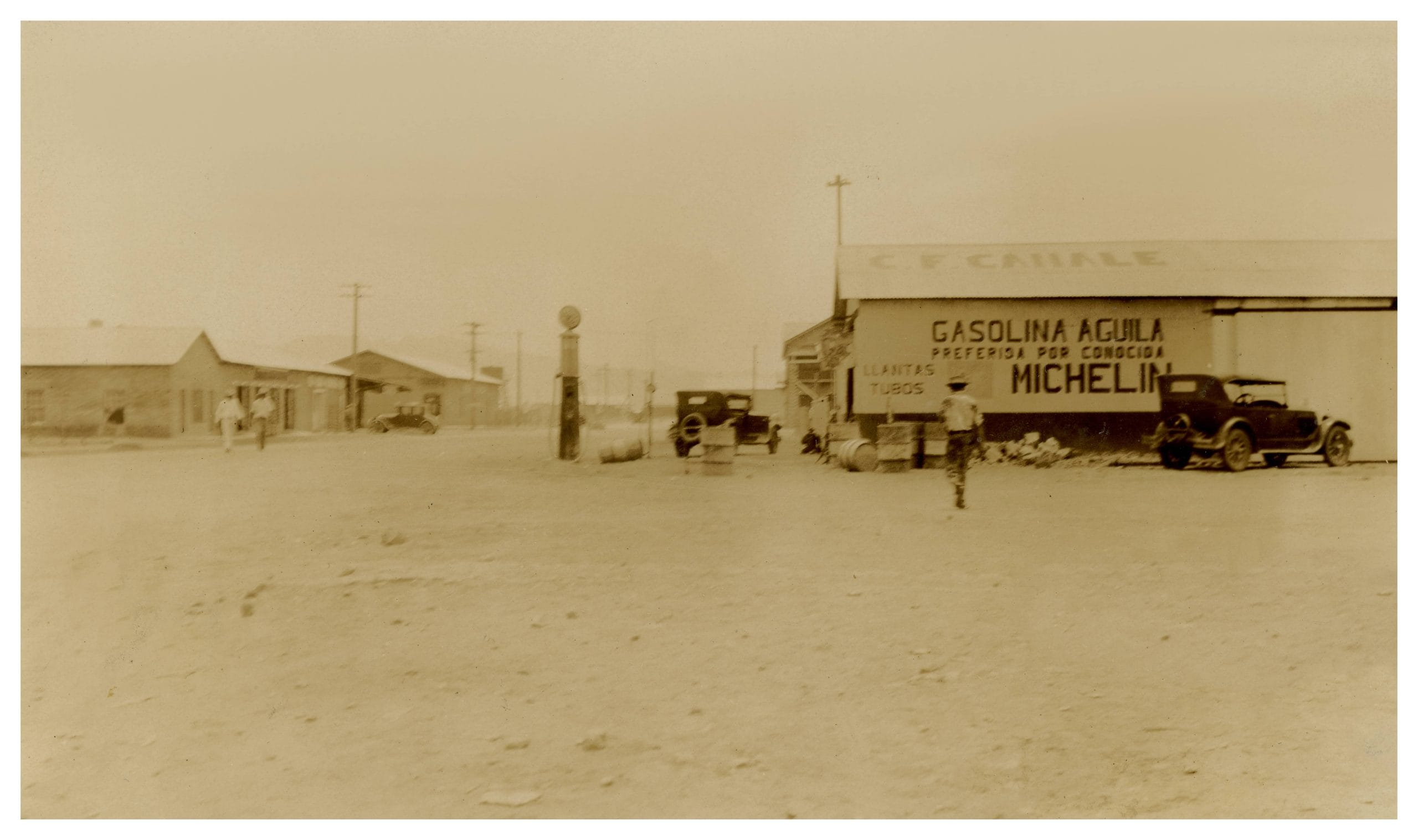 La fotografía documenta el rápido avance de la motorización en Cajeme y la consiguiente necesidad de servicios especializados. Muestra la estación de gasolina y venta de neumáticos de C. F. Canale's, ubicada estratégicamente cercana al negocio de automóviles Motor Car Co.