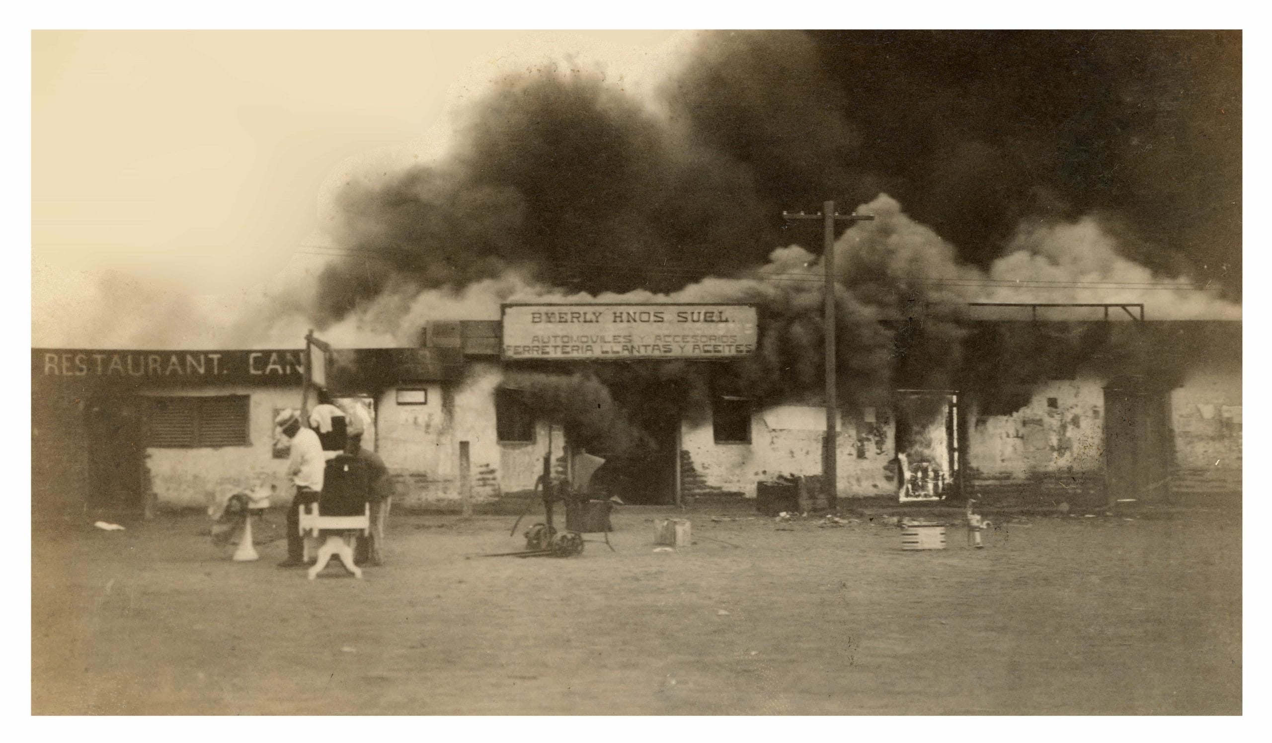 La fotografía documenta un incendio devastador que ocurrió en la Ferretería de Byerly Hermanos en la calle principal de Cajeme entre 1925 y 1926. El letrero visible indica que el negocio, además de ferretería, vendía accesorios para automóviles, llantas y aceites.