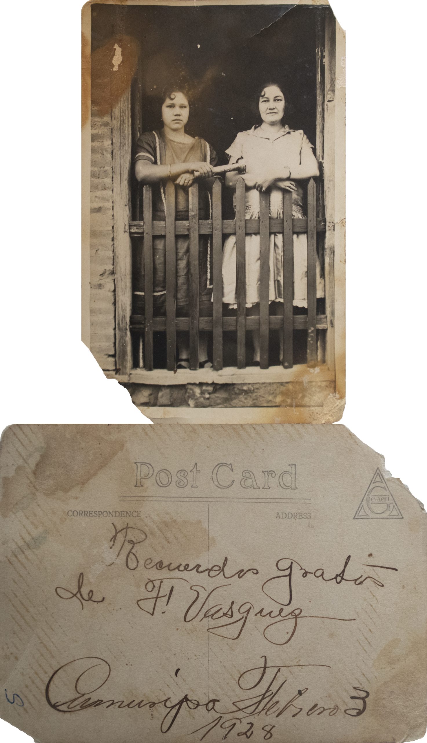 Fotografía mostrado 2 mujeres en la puerta de una casa en Cumuripa, Sonora, México. En el reverso aparece el texto: Recuerdo grátis de F. Vazquez. Cumuripa, febrero de 1928