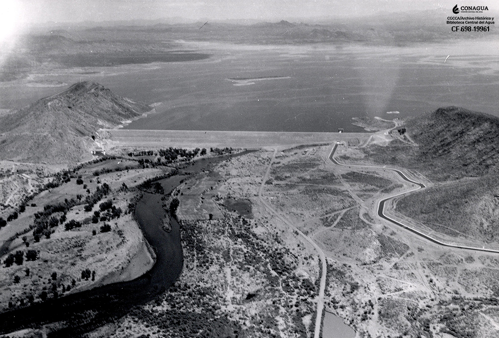 Panorámica del vaso de la presa Álvaro Obregón o El Oviáchic y su cortina de almacenamiento. La presa fue construida entre 1947 y 1952 para el Distrito de Riego 041 Río Yaqui y generación de energía eléctrica. Cuenta con dos obras de toma: una en la margen izquierda y más alta, operada por el DR 041, que da origen al canal Alto del Yaqui; y otra, en la margen derecha (canal Bajo del Yaqui), operada por la Comisión Federal de Electricidad (CFE).