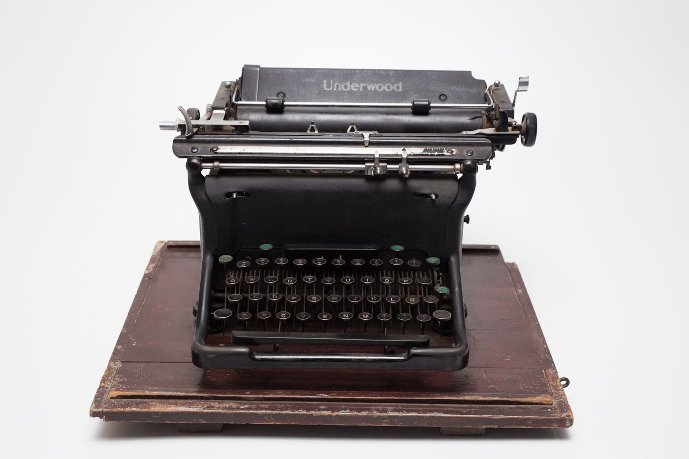Máquina de escribir mecánica marca Underwood, tiene un acabado en pintura laca color negro, conserva todas sus teclas las cuales se encuentran enmarcada por arillos niquelados. Las máquinas de escribir de esta marca fueron testigos de hechos y acontecimientos de la historia mundial, debido a que fueron de las primeras en fabricarse.