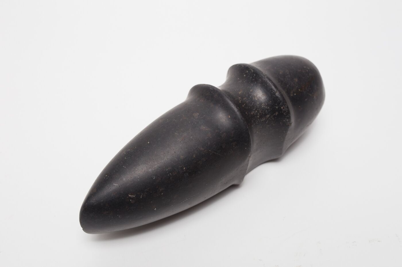 Su forma esférica y ligeramente ovoide en ambos extremos da la idea de su propósito como mazo. Presenta desgaste natural y pérdida de material en borde posterior inferior izquierdo.