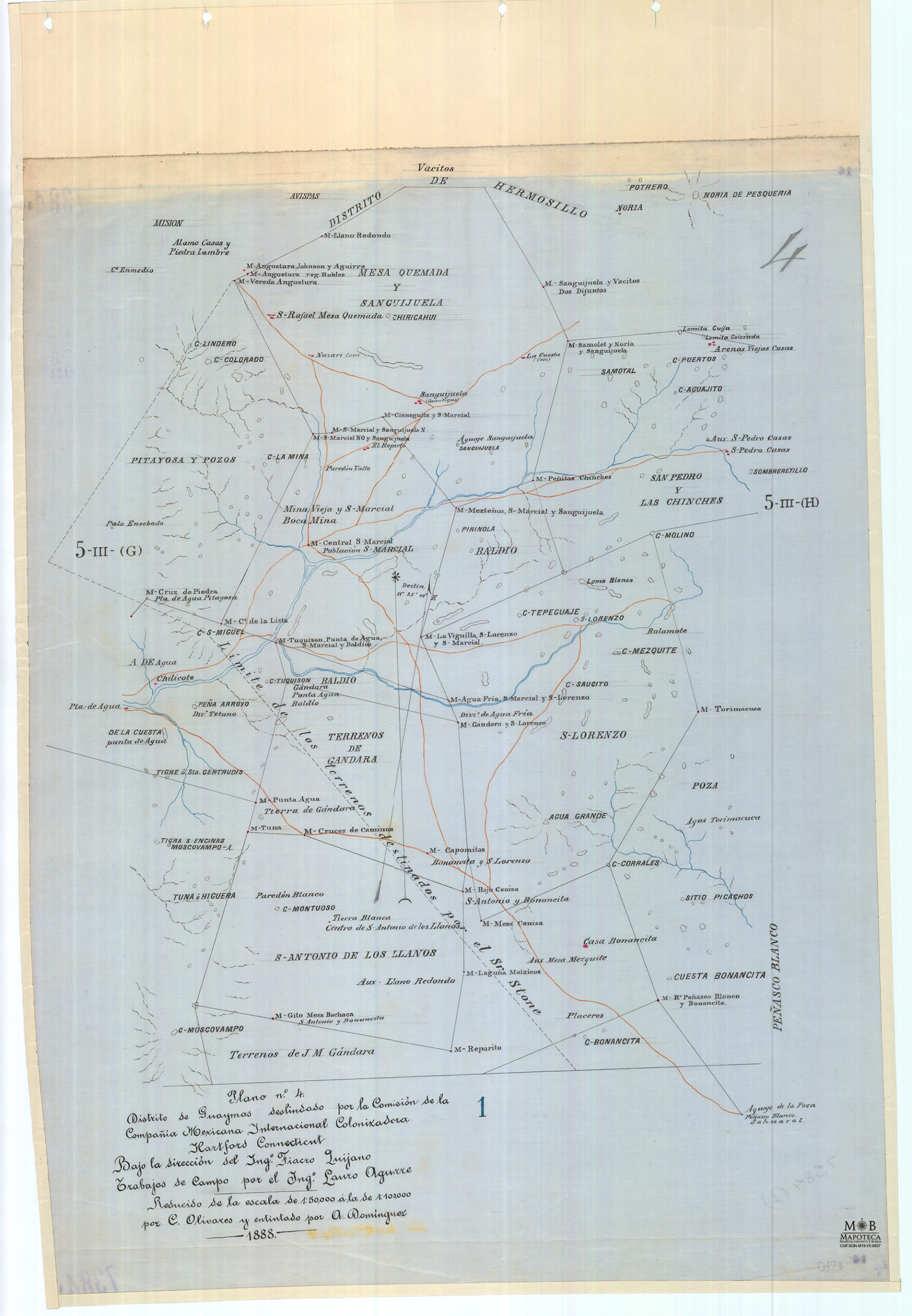 Reducción del plano 4, hojas 1 y 2: línea de terrenos deslinados por la Casa Jecker; límite con el Distrito de Hermosillo; poblaciones de: La Noria, San Marcial, San Lorenzo, Bonancita y Peñasco Blanco; cerros Tetacombiate y Bacatete.
