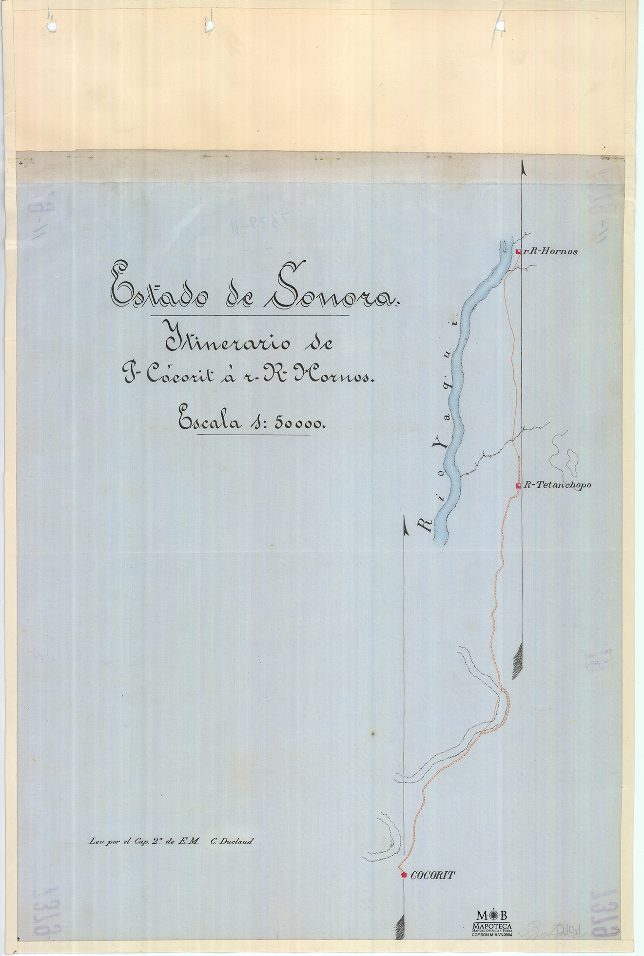 El croquis lo realizaron ingenieros militares de la Comisión Científica de Sonora (CCS), destacamento operativo de la Comisión Geográfico Exploradora (CGE) encargado de apoyar a la Secretaría de Guerra y Fomento en la pacificación, deslinde y colonización de los valles de los ríos Yaqui y Mayo en Sonora. Una de las funciones de la CCS era recopilar datos de la configuración del terreno estatal, para posteriormente utilizar esa información con la suficiente claridad para influir en los proyectos de operaciones de guerra, pacificación y administración del territorio. Entre la documentación resultado de lo anterior resultó la elaboración de los itinerarios, realizados por el personal militar, durante el desempeño de sus reconocimientos tácticos, también se encargaron de los levantamientos necesarios para la formación de las hojas cartográficas concernientes al territorio sonorense para incluirse en la Carta General de la República Mexicana a escala 1:100 000, magno proyecto por el cual el presidente Porfirio Díaz creó a la CGE; ésta institución trabajó en esta labor desde 1878 hasta 1914.