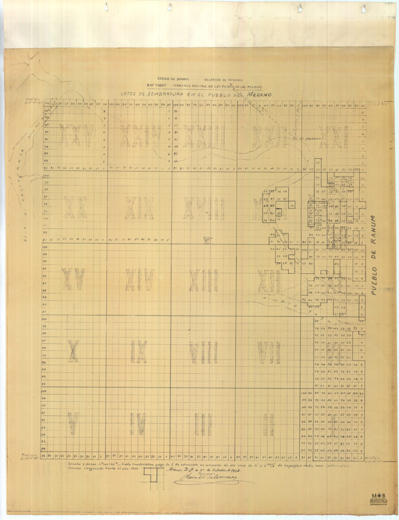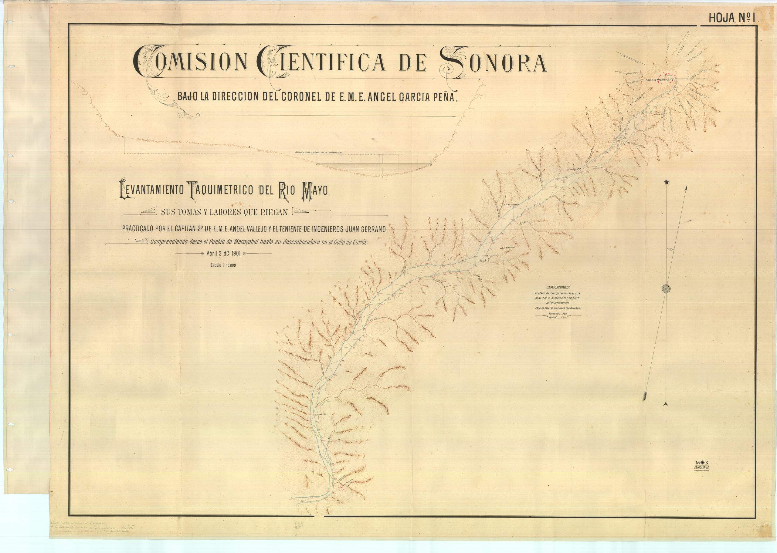 Levantamiento taquimétrico del rio Mayo realizado el 3 de abril de 1901. Señala las tomas para canales de riego así como las tierras de cultivo que riegan. Fue realizado por el capitán 2° de E.M.E Ángel Vallejo y el teniente de ingenieros Juan Serrano, bajo la dirección del coronel de E.M.E Ángel García Peña, jefe de la Comisión Científica de Sonora.