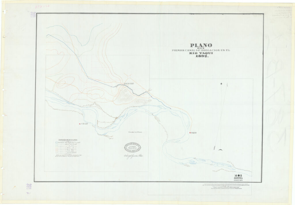 Levantamiento taquimétrico del rio Mayo realizado el 3 de abril de 1901. Señala las tomas para canales de riego así como las tierras de cultivo que riegan. Fue realizado por el capitán 2° de E.M.E Ángel Vallejo y el teniente de ingenieros Juan Serrano, bajo la dirección del coronel de E.M.E Ángel García Peña, jefe de la Comisión Científica de Sonora.