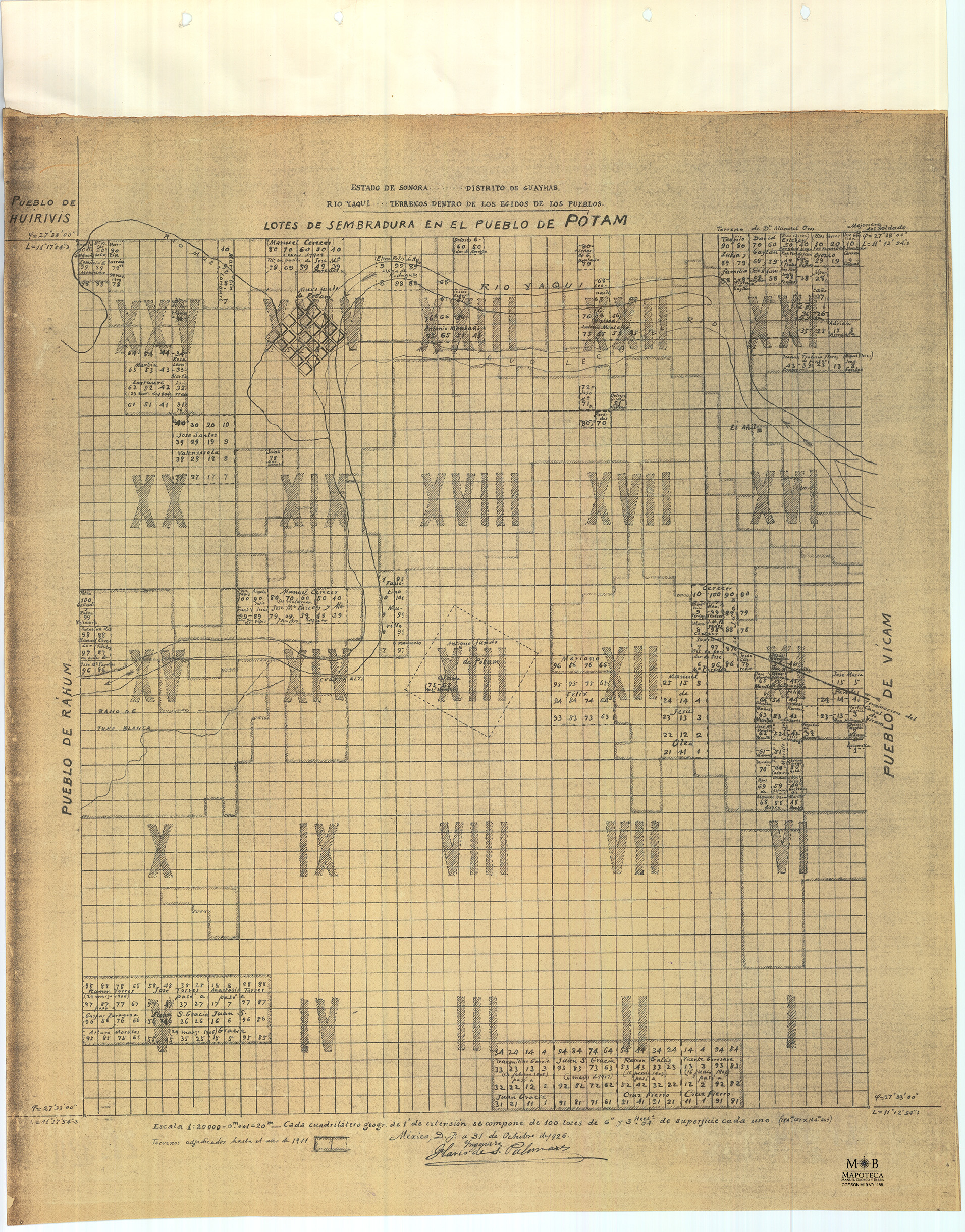 Plano para el registro catastral de lotes pertenecientes al pueblo yaqui de Pótam, con fecha de realización en 31 de octubre de 1926, casi cuarenta años después de los primeros levantamientos elaborados entre 1888 y 1890. Fue realizado por la Comisión Geográfica Exploradora, dependencia adscrita al Ministerio de Fomento y Guerra en el marco del proyecto para el trazo, colonización y reparto de tierras a los pueblos yaquis y mayos. Los levantamientos y deslindes establecidos en los pueblos yaquis para tener claridad fiscal debían cumplir con las siguientes características: los deslindes debían tener fundamento en puntos de referencia que permitieran localizar mediante coordenadas geográficas cada lugar (en la práctica serían las mojoneras), una vez realizado lo anterior, se debía trazar un cuadrilátero perfecto que delimitara el espacio territorial de cada pueblo, este cuadrilátero o Colonia agrícola se dividía en veinticinco secciones identificadas mediante números romanos, y estas a su vez fueron divididas en lotes de dos clases, unos para la “sembradura” o suelo agrícola, y otros para ser utilizados como “solares” o suelo urbano destinados para vivienda; tal organización territorial tenía gran semejanza con las trazas urbanas presentadas en los Estados Unidos desde finales del siglo XVIII. El presente plano se enfoca únicamente a mostrar el suelo agrícola.