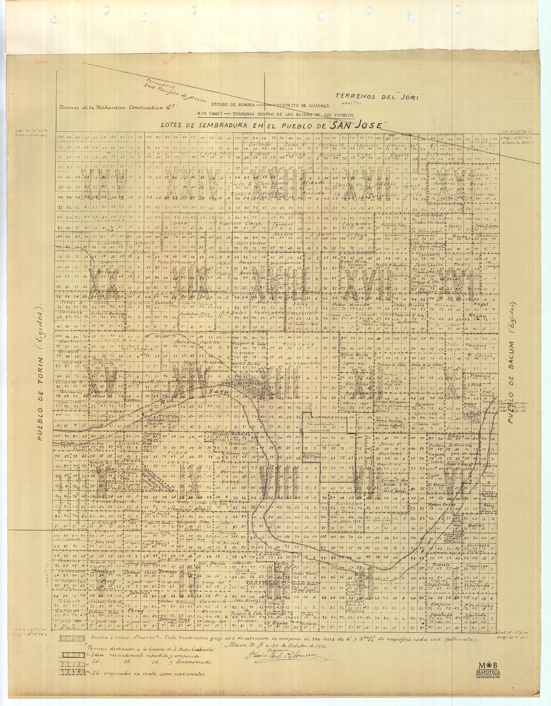 Plano para el registro catastral de lotes pertenecientes al pueblo yaqui de San José, con fecha de realización en 31 de octubre de 1926, casi cuarenta años después de los primeros levantamientos elaborados entre 1888 y 1890. Fue realizado por la Comisión Geográfica Exploradora, dependencia adscrita al Ministerio de Fomento y Guerra en el marco del proyecto para el trazo, colonización y reparto de tierras a los pueblos yaquis y mayos. Los levantamientos y deslindes establecidos en los pueblos yaquis para tener claridad fiscal debían cumplir con las siguientes características: los deslindes debían tener fundamento en puntos de referencia que permitieran localizar mediante coordenadas geográficas cada lugar (en la práctica serían las mojoneras), una vez realizado lo anterior, se debía trazar un cuadrilátero perfecto que delimitara el espacio territorial de cada pueblo, este cuadrilátero o Colonia agrícola se dividía en veinticinco secciones identificadas mediante números romanos, y estas a su vez fueron divididas en lotes de dos clases, unos para la “sembradura” o suelo agrícola, y otros para ser utilizados como “solares” o suelo urbano destinados para vivienda; tal organización territorial tenía gran semejanza con las trazas urbanas presentadas en los Estados Unidos desde finales del siglo XVIII. El presente plano se enfoca únicamente a mostrar el suelo agrícola.