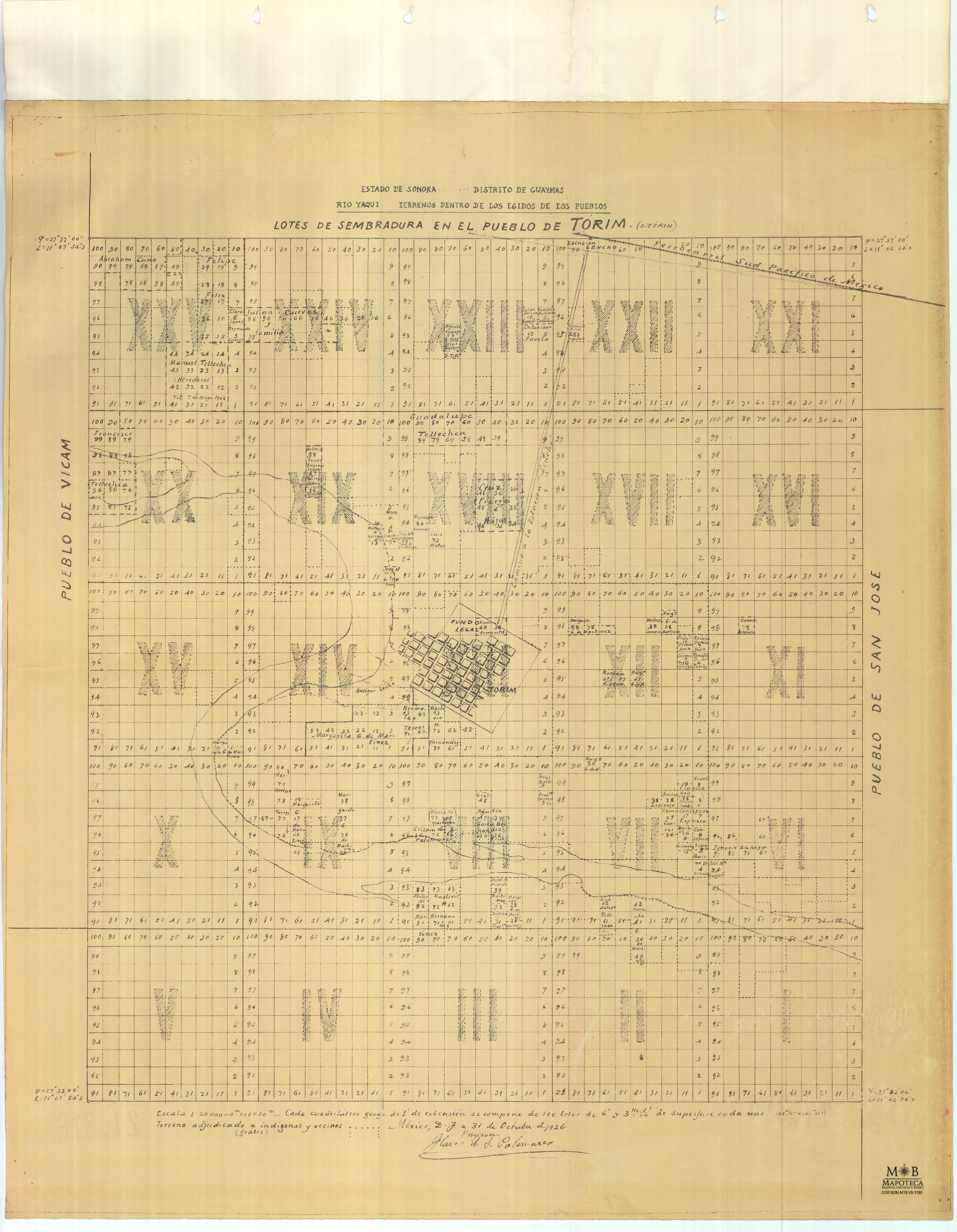 Plano para el registro catastral de lotes pertenecientes al pueblo yaqui de Tórim, con fecha de realización en 31 de octubre de 1926, casi cuarenta años después de los primeros levantamientos hechos entre 1888 y 1890. Fue realizado por la Comisión Geográfica Exploradora, dependencia adscrita al Ministerio de Fomento y Guerra en el marco del proyecto para el trazo, colonización y reparto de tierras a los pueblos yaquis y mayos. Los levantamientos y deslindes realizados en los pueblos yaquis para tener claridad fiscal debían cumplir con las siguientes características: los deslindes debían tener fundamento en puntos de referencia que permitieran localizar mediante coordenadas geográficas cada lugar (en la práctica serían las mojoneras), una vez realizado lo anterior, se debía trazar un cuadrilátero perfecto que delimitara el espacio territorial de cada pueblo, este cuadrilátero o Colonia agrícola se dividía en veinticinco secciones identificadas mediante números romanos, y estas a su vez fueron divididas en lotes de dos clases, unos para la “sembradura” o suelo agrícola, y otros para ser utilizados como “solares” o suelo urbano destinados para vivienda; tal organización territorial tenía gran semejanza con las trazas urbanas presentadas en los Estados Unidos desde finales del siglo XVIII. El presente plano se enfoca únicamente a mostrar el suelo agrícola.