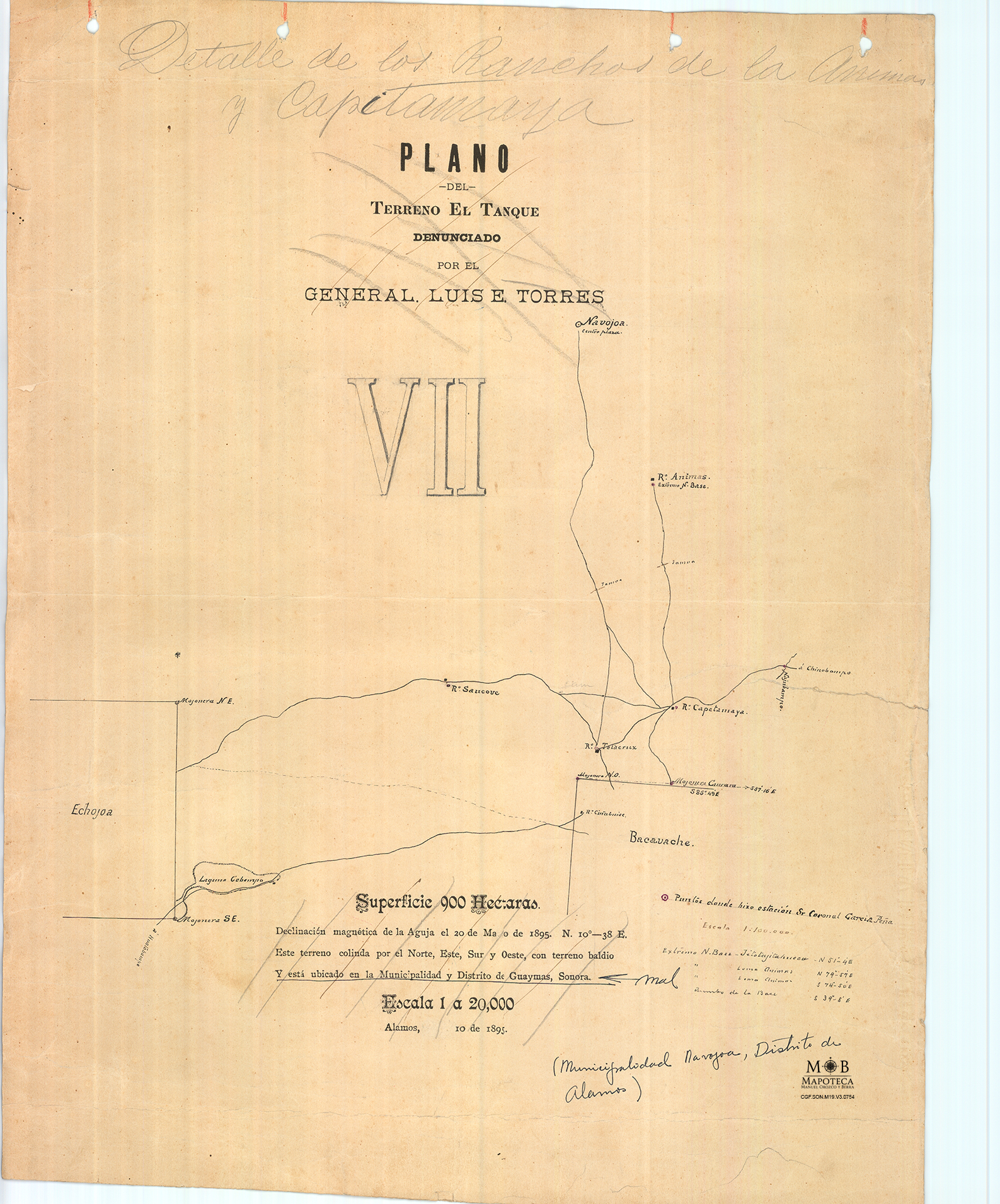 Plano de reconocimiento y deslinde cuyas principales características de identificación fueron corregidas por presentar errores en nombre y dimensiones de ubicación. Los trazos correctos sitúan parte de los pueblos pertenecientes a la municipalidad de Navojoa, Distrito de Álamos. Están señalados los ranchos: Ánimas, Capetamaya, Talacruz y Saucove; los caminos y veredas que conectan a las poblaciones; la laguna Cobampo y los cuadrantes correspondientes al levantamiento de las colonias agrícolas de Etchojoa y Bacabache.