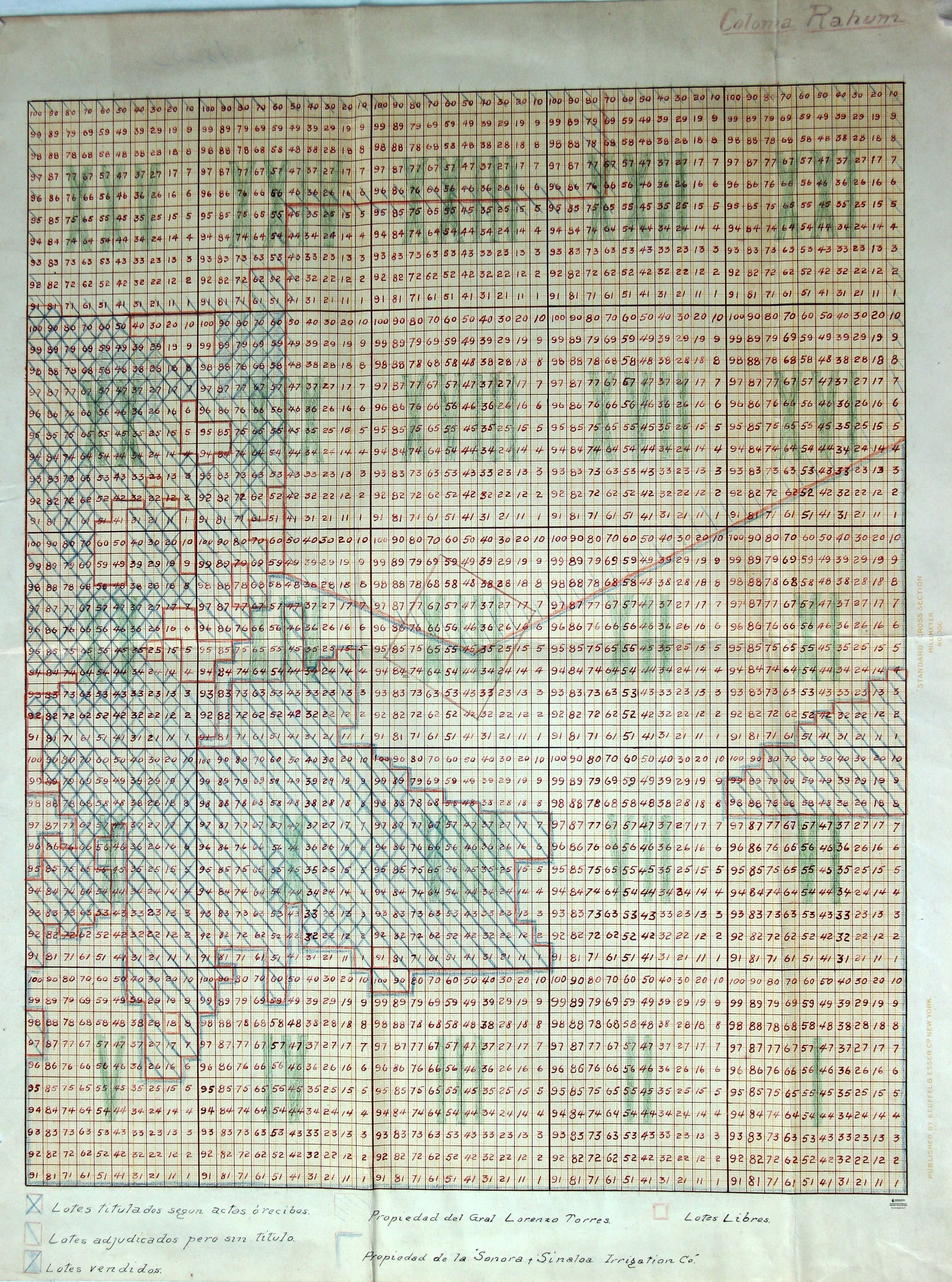 Plano que indica el deslinde de terrenos pertenecientes al pueblo yaqui de Ráhum. Los levantamientos y deslindes realizados en los pueblos yaquis para tener claridad fiscal debían cumplir con las siguientes características: dentro del cuadrilátero perfecto que delimitaba el espacio territorial de cada pueblo, se realizaba una división compuesta por veinticinco secciones identificadas mediante números romanos, y estas a su vez fraccionadas en lotes de dos clases, unos para la “sembradura” o suelo agrícola, y otros para ser utilizados como “solares” o suelo urbano destinado para vivienda.