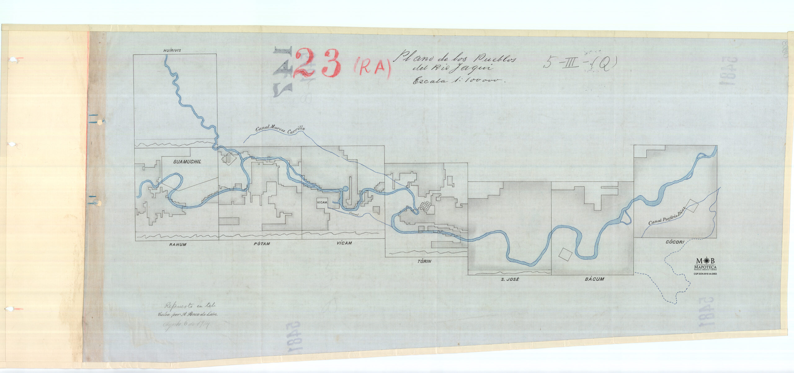 Repuesto en tela calca del Plano de los pueblos del río Yaqui por A. Ponce de León realizado el 6 de agosto de 1914. Las localidades Yaquis están delimitadas por cuadriláteros contiguos, pueblos y canales.