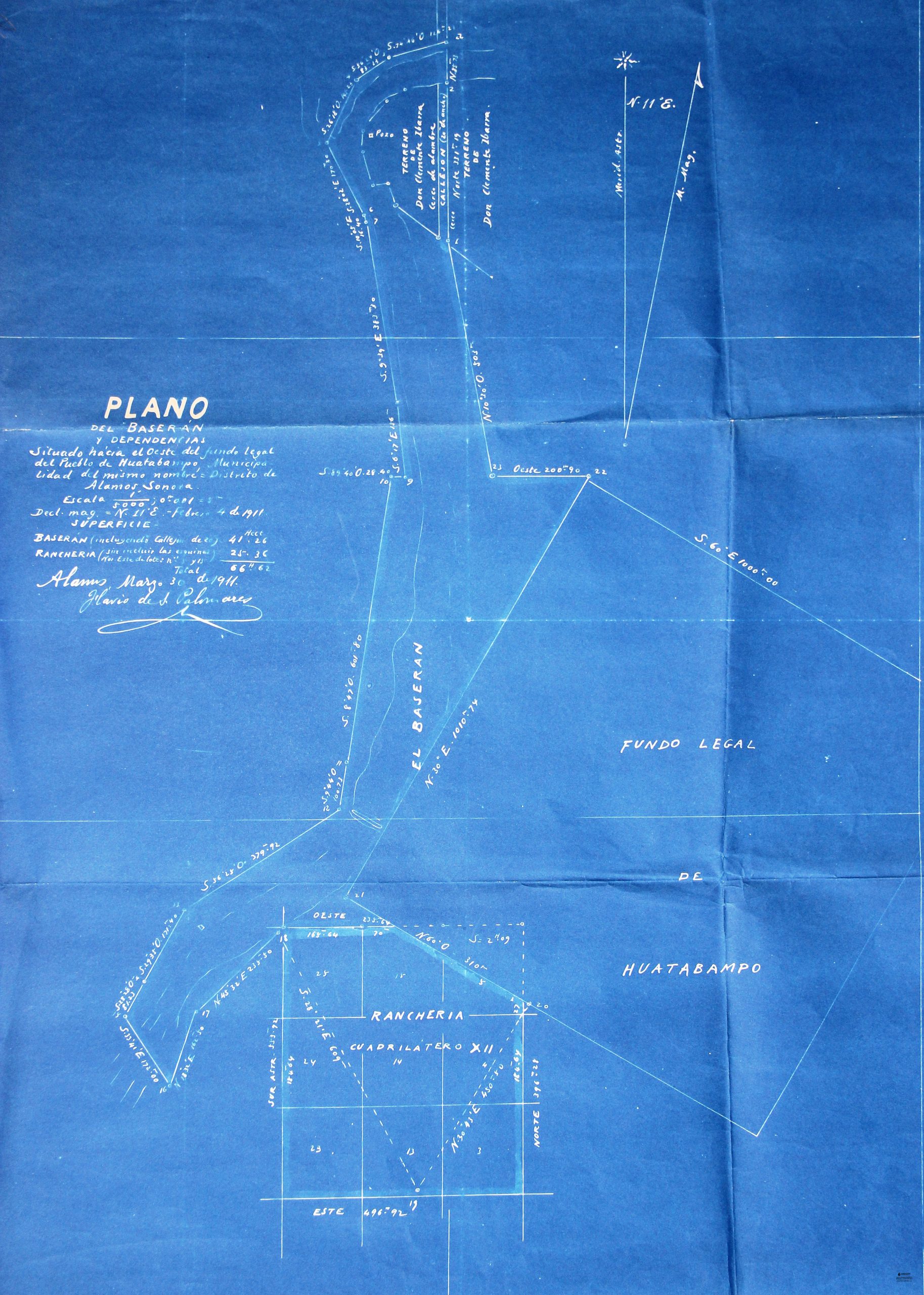 Copia heliográfica del plano del manantial El Baserán, ubicado en la parte noroeste del pueblo de Huatabampo. Añade coordenadas geográficas para localización de cada punto.