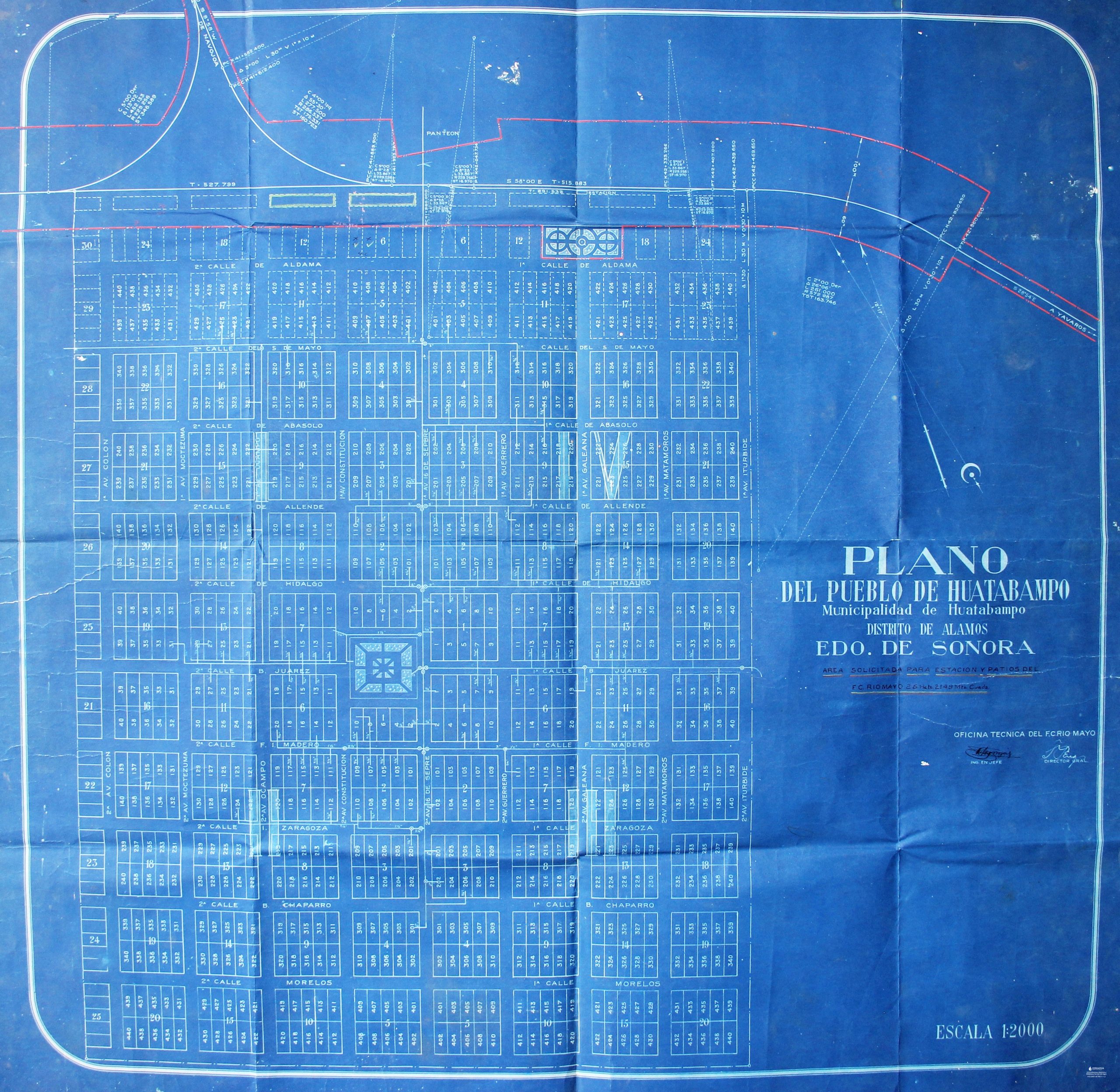 Plano del fundo legal del pueblo Mayo de Huatabampo, ubicado en los cuadrantes XI y parte del XII del plano general del pueblo. En él se aprecian perfectamente el trazo y diseño del pueblo mediante un sistema de cuadrículas que partía de dos ejes perpendiculares. Estos ejes constituyeron las líneas de referencia del sistema, en función de ellas se trazaron las arterias viales y se definieron las manzanas, ubicando al centro la plaza principal de la población. Así como en las otras poblaciones mayos y yaquis, en el plano se asigna e identifica un número de lote, tanto para la zona este como oeste, permitiendo llevar la administración catastral.