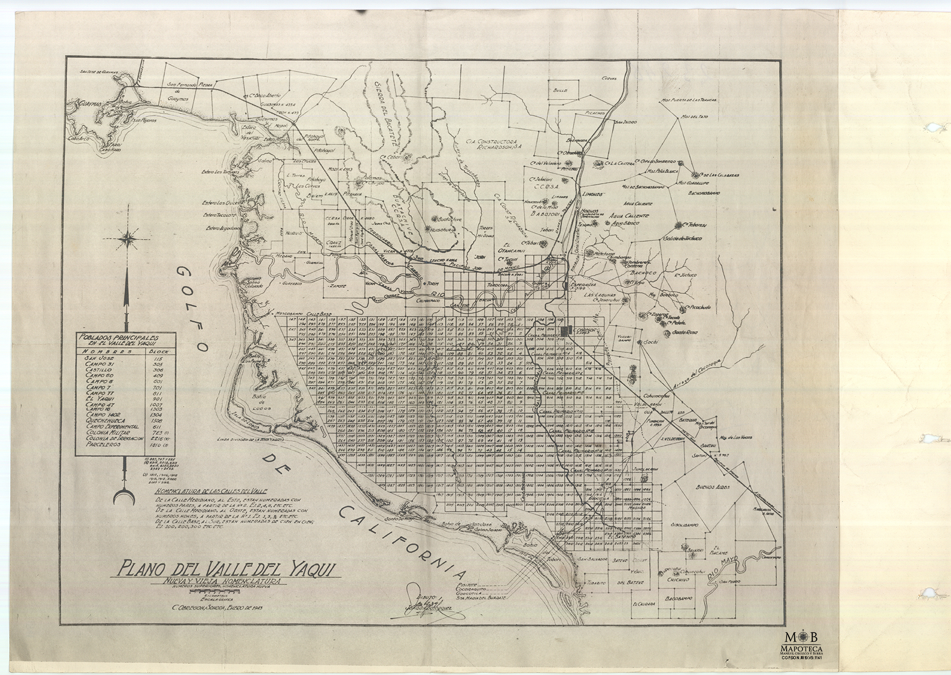 Plano del Valle del Yaqui: nueva y vieja nomenclatura
