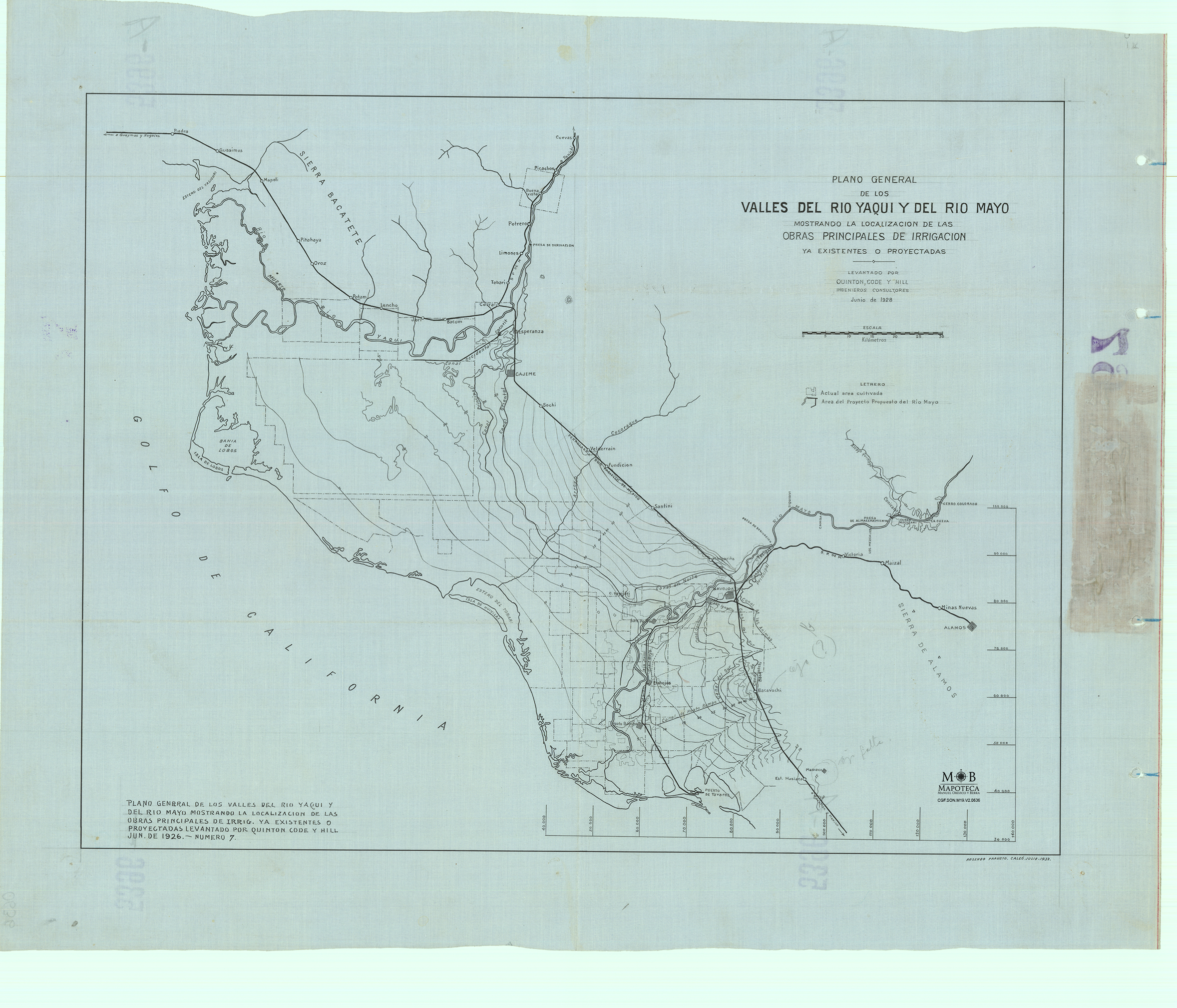 El presente plano realizado por la compañía Quinton, Code y Hill, quien estaba bajo contrato de la CNI para recabar información sobre las zanas hídricas del Valle del Yaqui, plasma en el documento el sistema implantado por la CCR, justo en el año de salida de la compañía, delineando en el documento los levantamientos y deslindes realizados desde los pueblos yaquis hasta la zona sur del Valle del Mayo; como se puede ver, se indican una gran cantidad de cuadrantes y polígonos que delimitan cada uno de los terrenos adjudicados a inversionistas del valle, en su mayoría extranjeros o no yaquis.