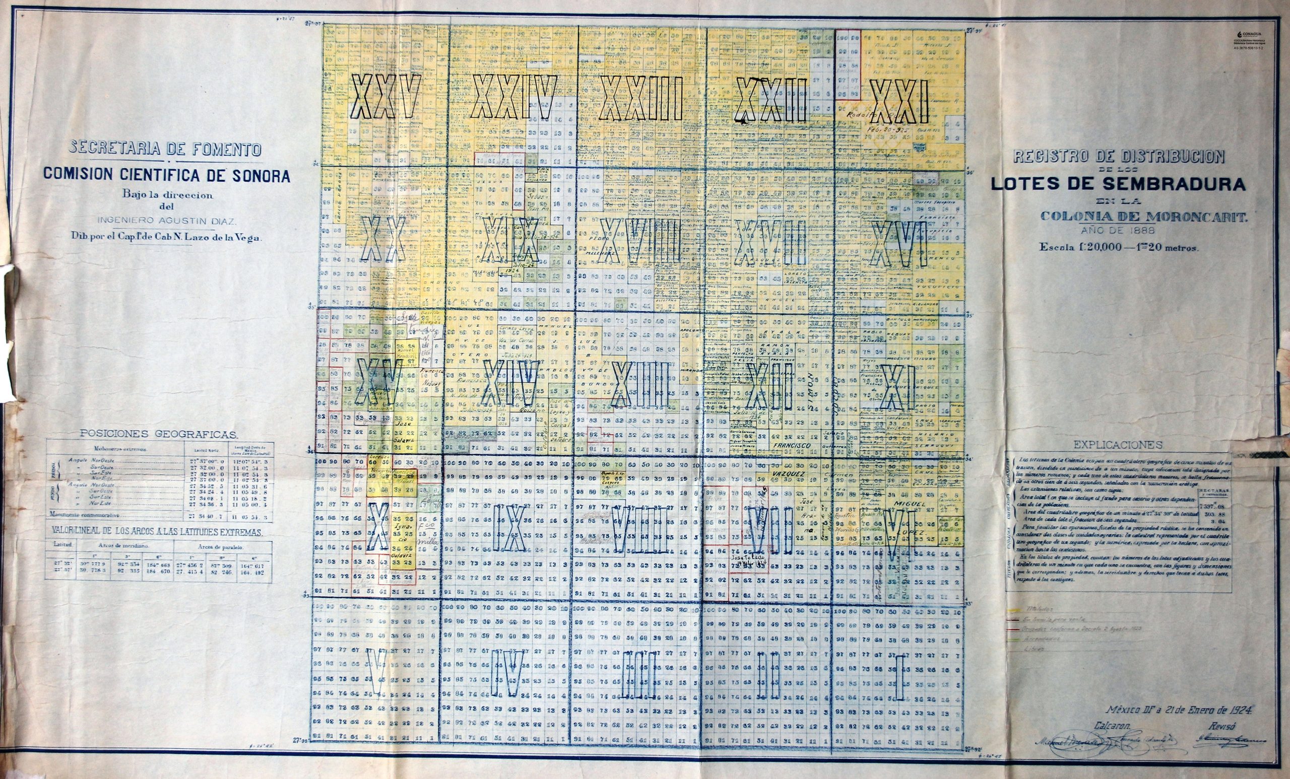 Calca a color del plano para el deslinde y registro catastral de lotes pertenecientes al pueblo mayo de Moroncarit, realizada para actualización de datos en 1924. Originalmente fue realizado por la Comisión Geográfica Exploradora, dependencia adscrita al Ministerio de Fomento y Guerra en el marco del proyecto para el trazo, colonización y reparto de tierras a los pueblos yaquis y mayos. Los levantamientos y deslindes realizados en los pueblos yaquis para tener claridad fiscal debían cumplir con las siguientes características: dentro del cuadrilátero perfecto que delimitaba el espacio territorial de cada pueblo, se realizaba una división compuesta por veinticinco secciones identificadas mediante números romanos, y estas a su vez fraccionadas en lotes de dos clases, unos para la “sembradura” o suelo agrícola, y otros para ser utilizados como “solares” o suelo urbano destinado para vivienda; tal organización territorial tenía gran semejanza con las trazas urbanas presentadas en los Estados Unidos desde finales del siglo XVIII. El presente plano se enfoca únicamente a mostrar el suelo agrícola.