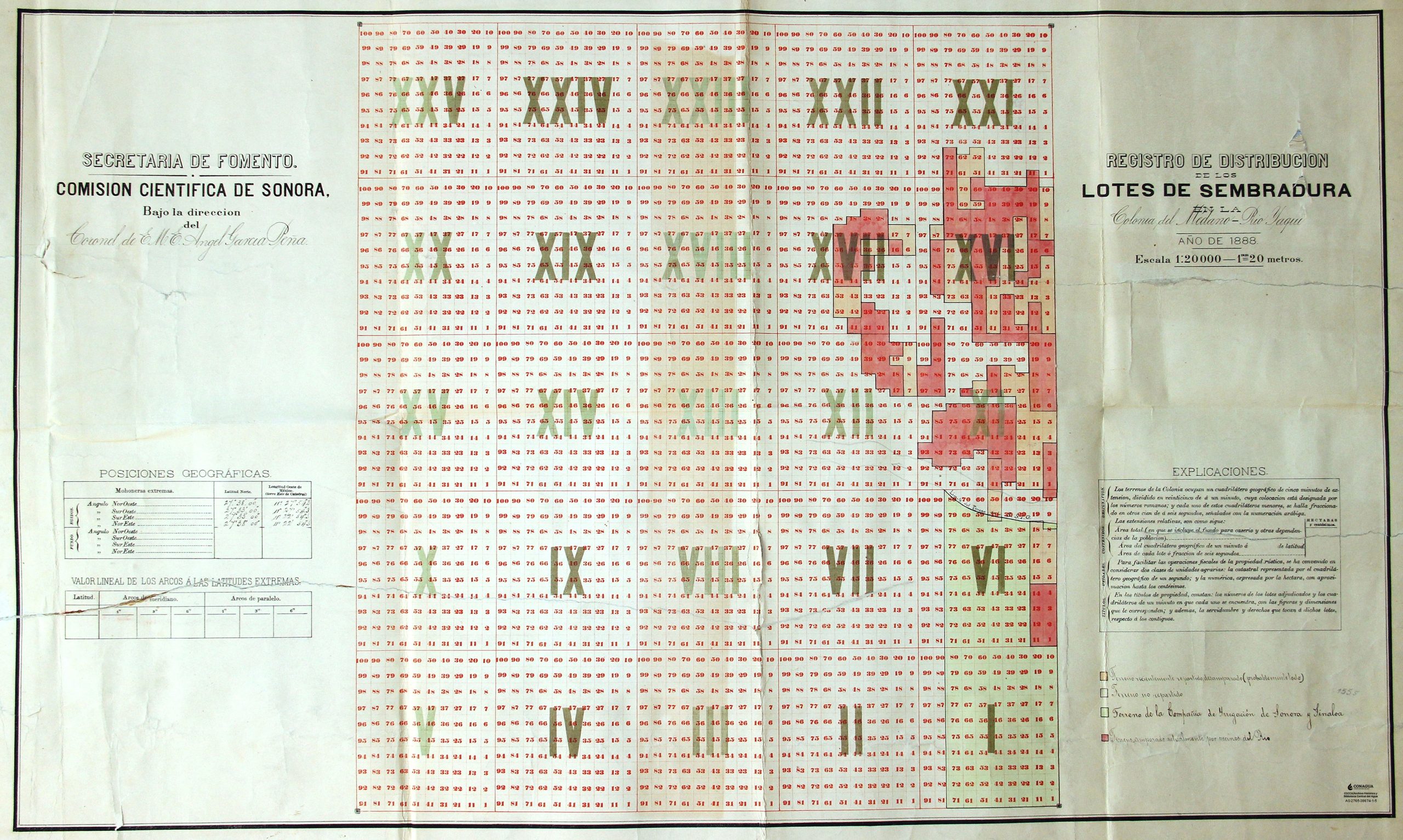 Los levantamientos y deslindes realizados en los pueblos yaquis para tener claridad fiscal debían cumplir con las siguientes características: dentro del cuadrilátero perfecto que delimitaba el espacio territorial de cada pueblo, se realizaba una división compuesta por veinticinco secciones identificadas mediante números romanos, y estas a su vez fraccionadas en lotes de dos clases, unos para la “sembradura” o suelo agrícola, y otros para ser utilizados como “solares” o suelo urbano destinado para vivienda. El presente plano se enfoca únicamente a mostrar el suelo agrícola.