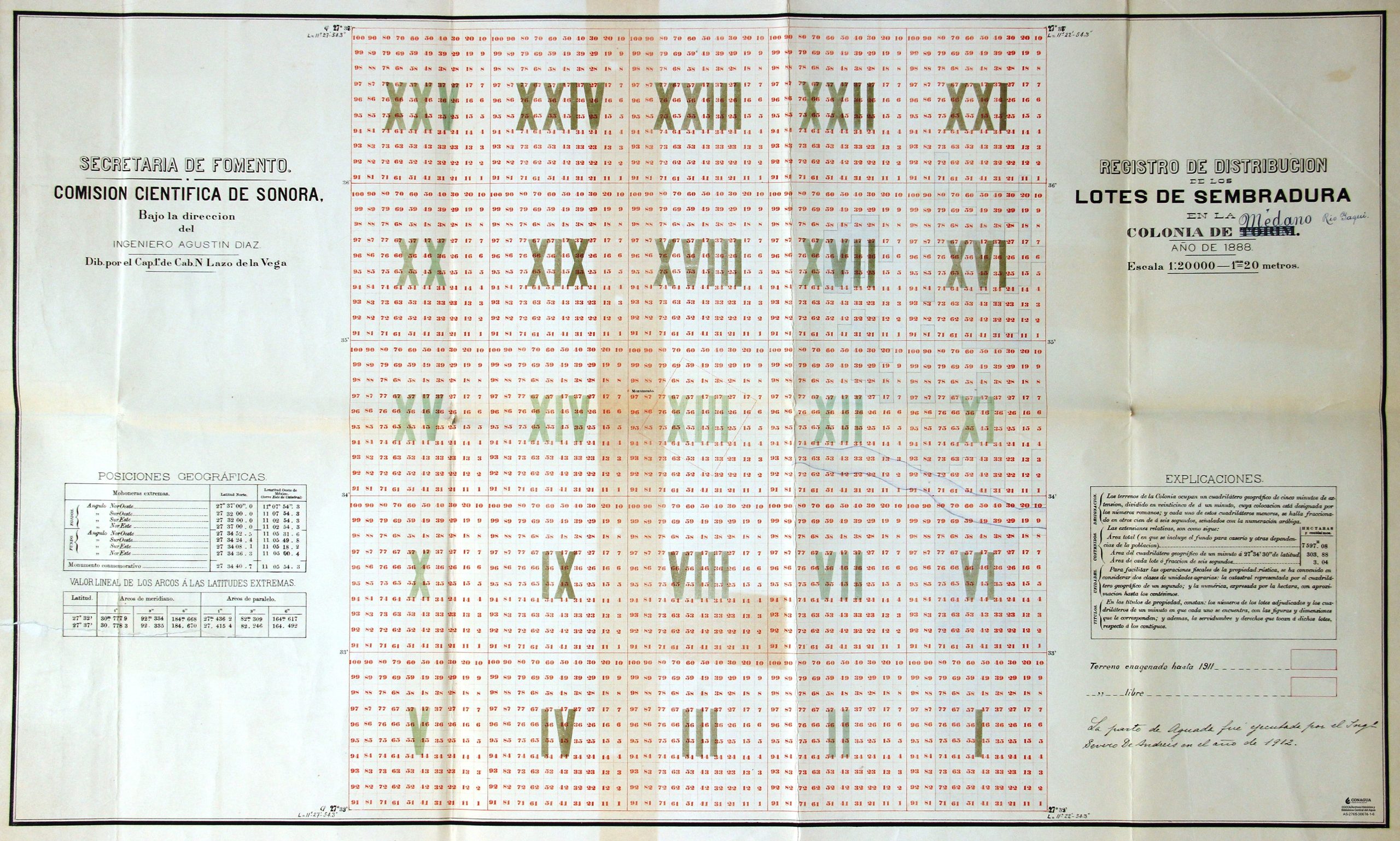 Plano base para el deslinde y registro catastral de lotes pertenecientes al Médano. Fue realizado por la Comisión Geográfica Exploradora, dependencia adscrita al Ministerio de Fomento y Guerra en el marco del proyecto para el trazo, colonización y reparto de tierras a los pueblos yaquis y mayos. Los levantamientos y deslindes realizados en los pueblos yaquis para tener claridad fiscal debían cumplir con las siguientes características: dentro del cuadrilátero perfecto que delimitaba el espacio territorial de cada pueblo, se realizaba una división compuesta por veinticinco secciones identificadas mediante números romanos, y estas a su vez fraccionadas en lotes de dos clases, unos para la “sembradura” o suelo agrícola, y otros para ser utilizados como “solares” o suelo urbano destinado para vivienda; tal organización territorial tenía gran semejanza con las trazas urbanas presentadas en los Estados Unidos desde finales del siglo XVIII. El presente plano se enfoca únicamente a mostrar el suelo agrícola.