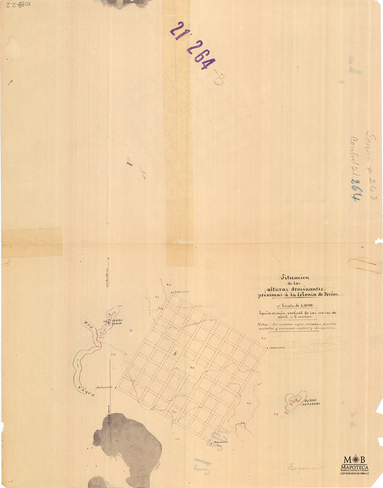 En los planos denominados Situación de las alturas dominantes próximas a la colonia de Tórim, los cuales constan de borrador y plano definitivo, se integra la siguiente información: la primera hoja se sitúa en la margen izquierda del río Yaqui y contiene: escala, tres notas de las cuales sólo una está manifestada como tal, éstas hacen referencia a la equidistancia vertical de las curvas de nivel a 5 metros, es decir, que a partir del modelo de curvas de nivel se representa la superficie topográfica de la colonia de Tórim con un desnivel o distancia vertical de 5 metros por dos curvas de nivel, la segunda nota aclara que los números rojos señalan puntos acotados que expresan metros y decímetros, y la tercera es abstrusa para su exposición, también podemos apreciar cerros, a los cuales se les aplica el mismo sistema de representación topográfica; la estructura de la colonia se forma por varios cuadrados y un rectángulo en el centro, con mojoneras en los cuatro extremos y se muestra un segmento del meridiano verdadero. La segunda funge como un esquicio de la primera, al encontrarse al reverso de la hoja se pueden identificar y comparar los elementos de ambas, desde el meridiano verdadero hasta los cerros.